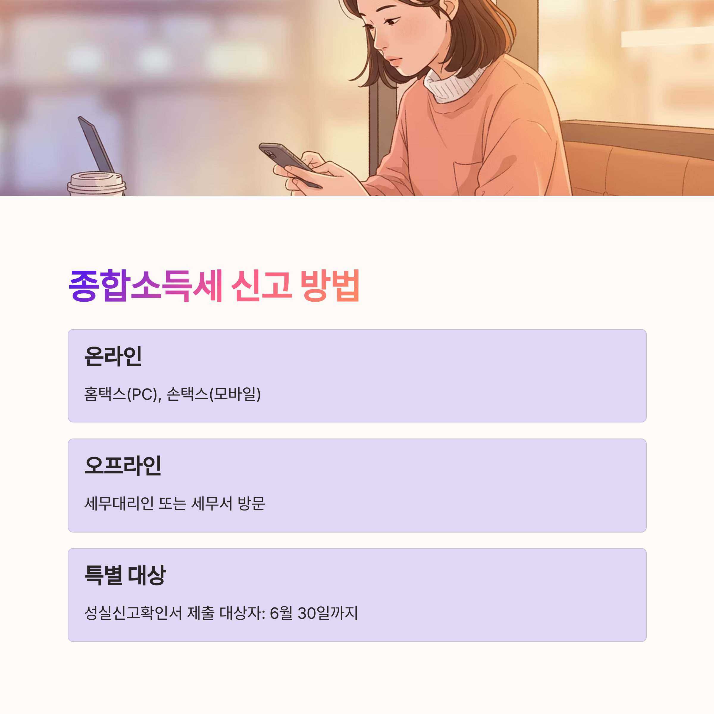 - 신고 방법: 홈택스(PC), 손택스(모바일), 세무대리인 또는 세무서 방문