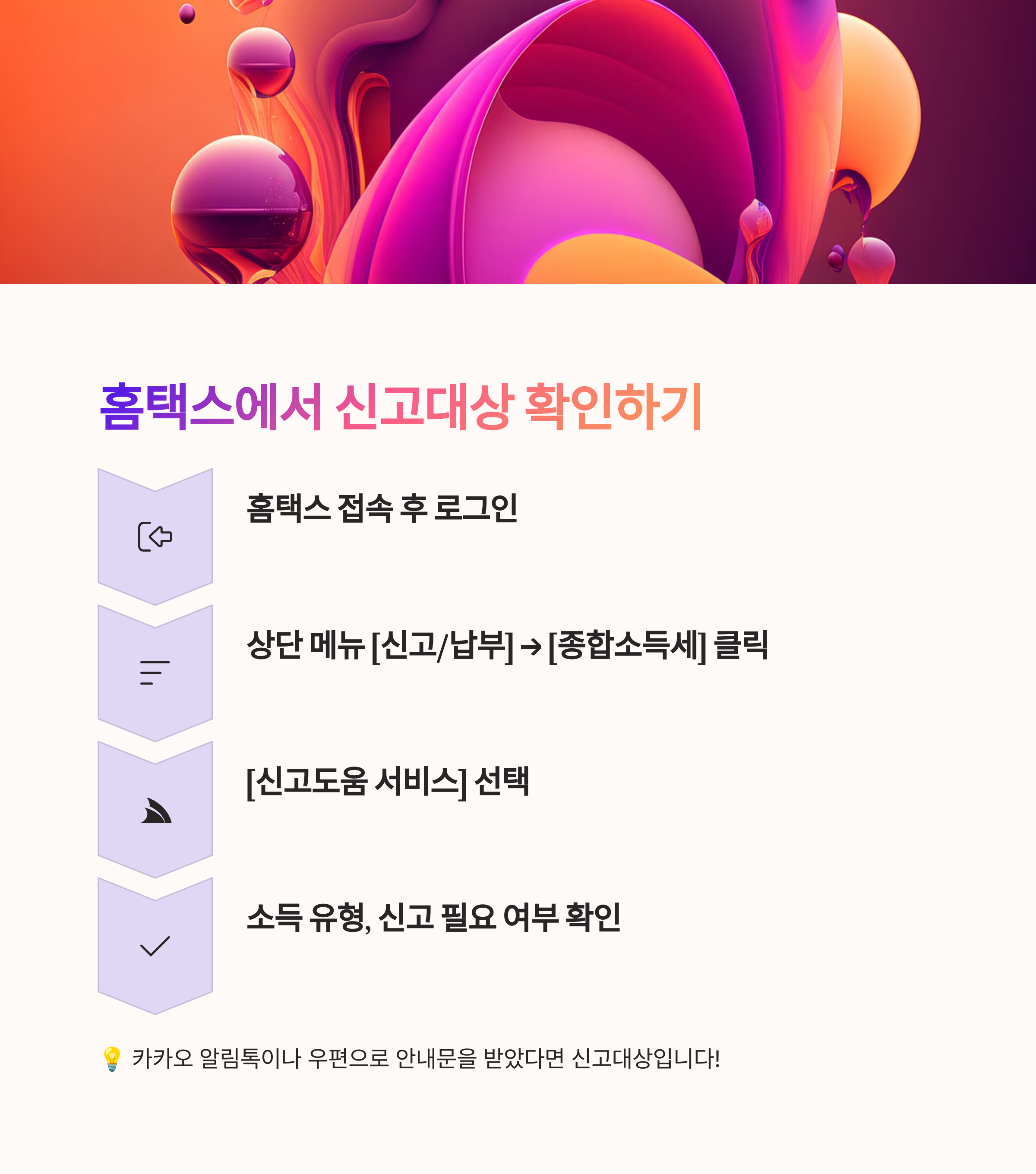 - 본인의 소득 유형, 신고 필요 여부, 제출 서류 등을 안내받을 수 있습니다