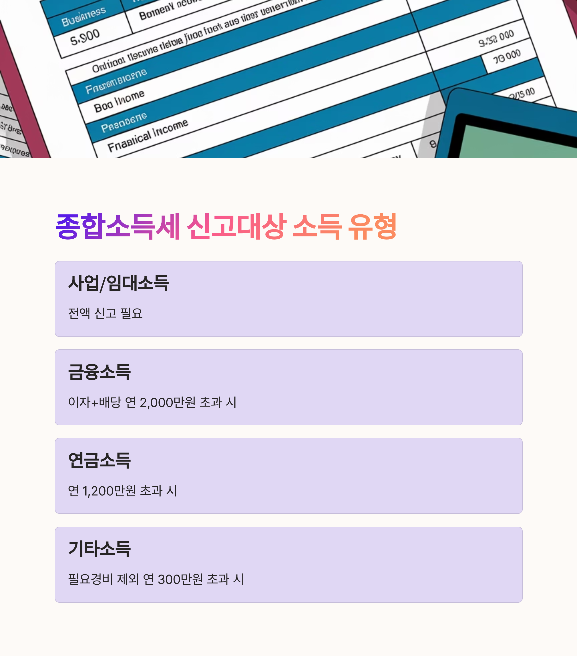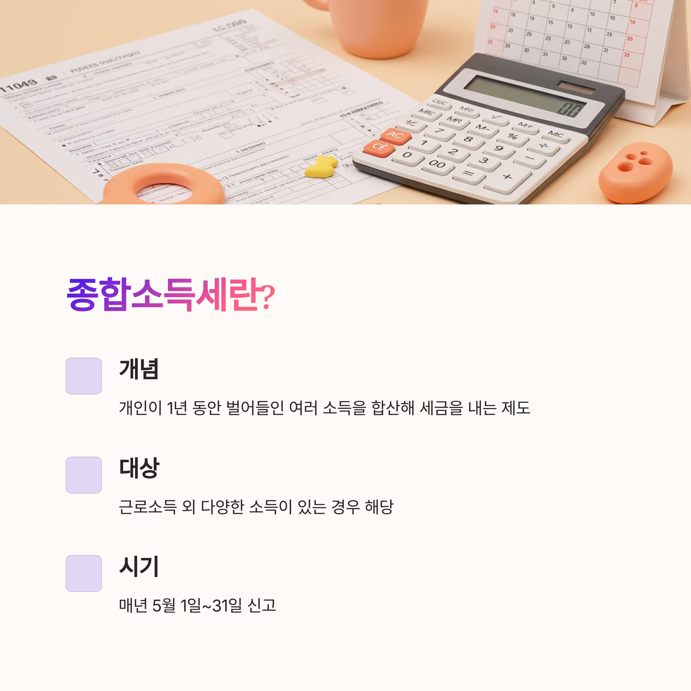종합소득세는 개인이 1년 동안 벌어들인 여러 가지 소득을 합산해 세금을 내는 제도입니다. 종합소득세 신고대상은 근로소득 외에 다양한 소득이 있는 경우 해당됩니다.