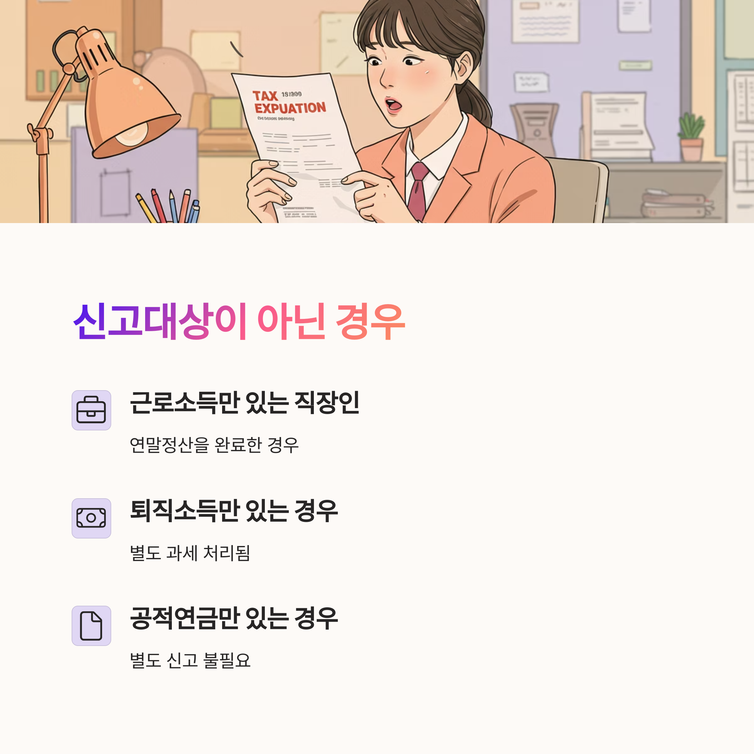 종합소득세 신고대상에서 제외되는 경우는 근로소득만 있고 연말정산을 완료한 직장인과 퇴직소득, 공적연금만 있는 경우입니다.