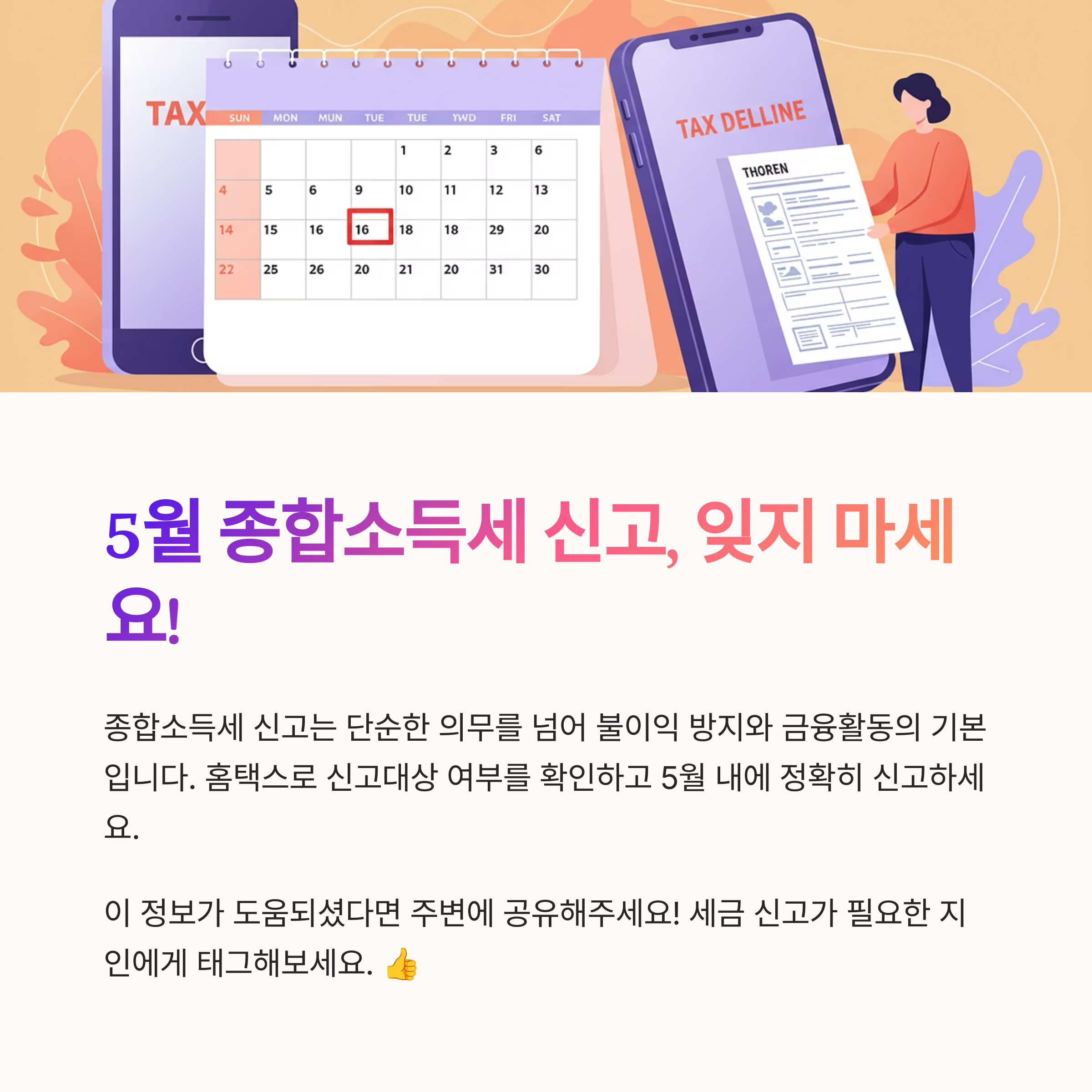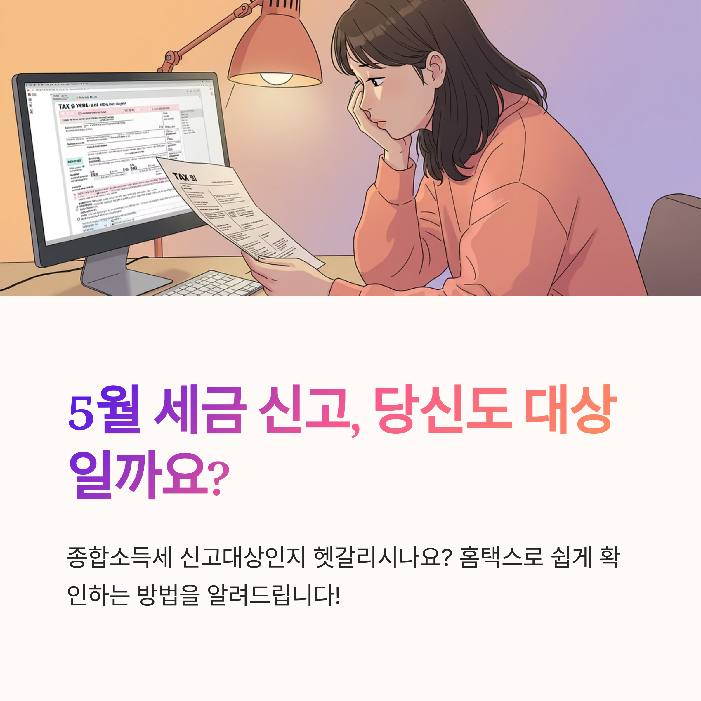 5월은 '세금의 달'이라 불릴 만큼 종합소득세 신고대상의 핵심 시기입니다. 특히 근로 외 소득이 있는 분들은 본인이 종합소득세 신고대상인지 헷갈릴 수 있는데요. 오늘은 홈택스를 통해 종합소득세 신고대상 여부를 간편하게 확인하는 방법과 함께, 종합소득세 신고대상자 조건을 정리해 드리겠습니다.