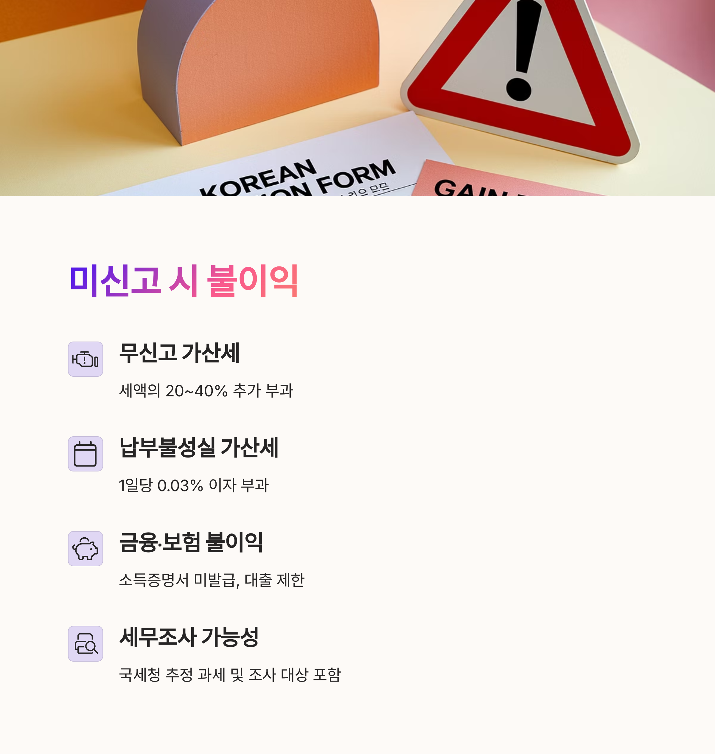 | 무신고 가산세 | 세액의 20~40% 추가 부과 |