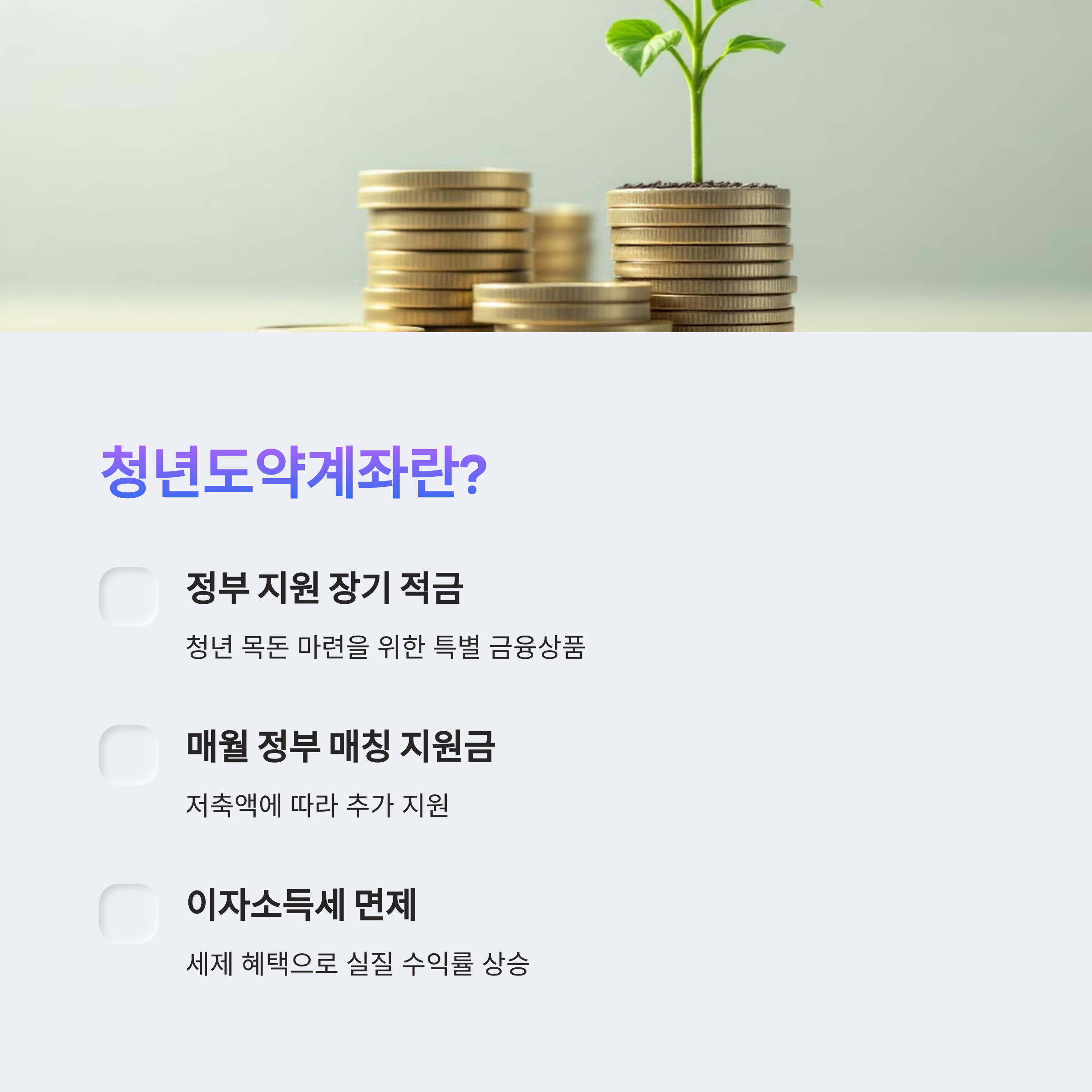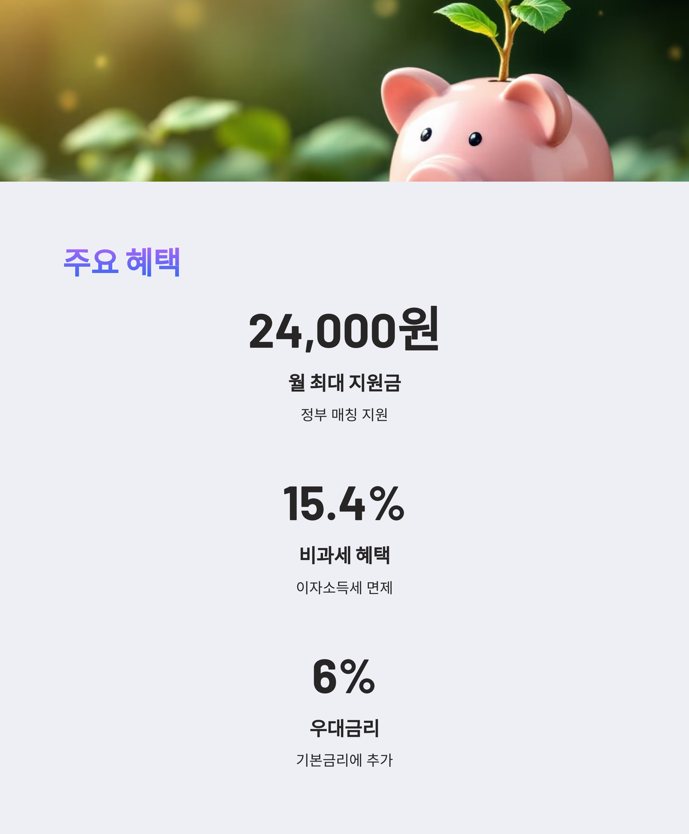 매월 일정 금액을 납입하면 정부가 추가 지원금을 매칭해주며, 이자소득세 면제 등 다양한 혜택이 주어집니다.