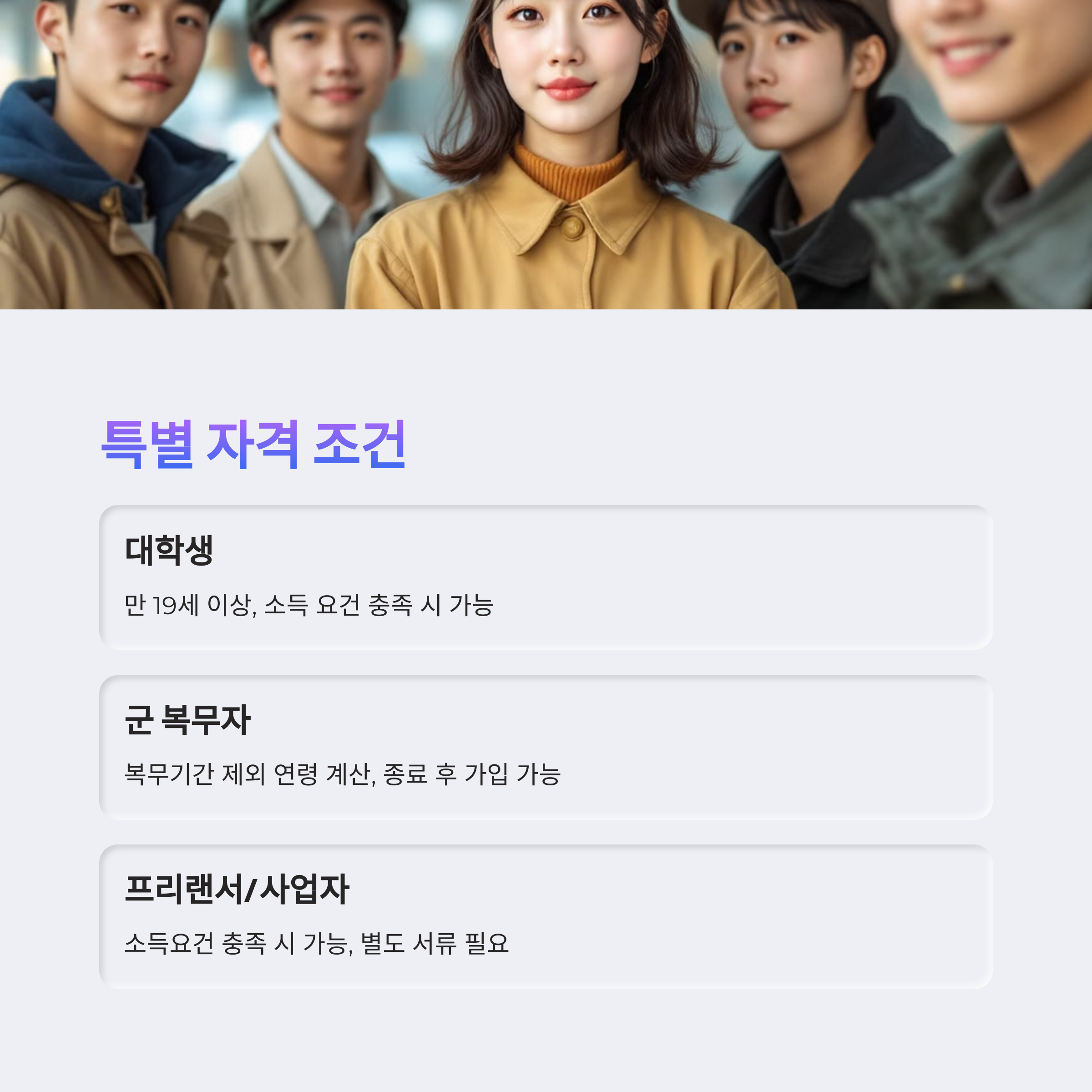 - 병역이행자의 경우 복무 기간만큼 가입 연령 상한 연장 가능