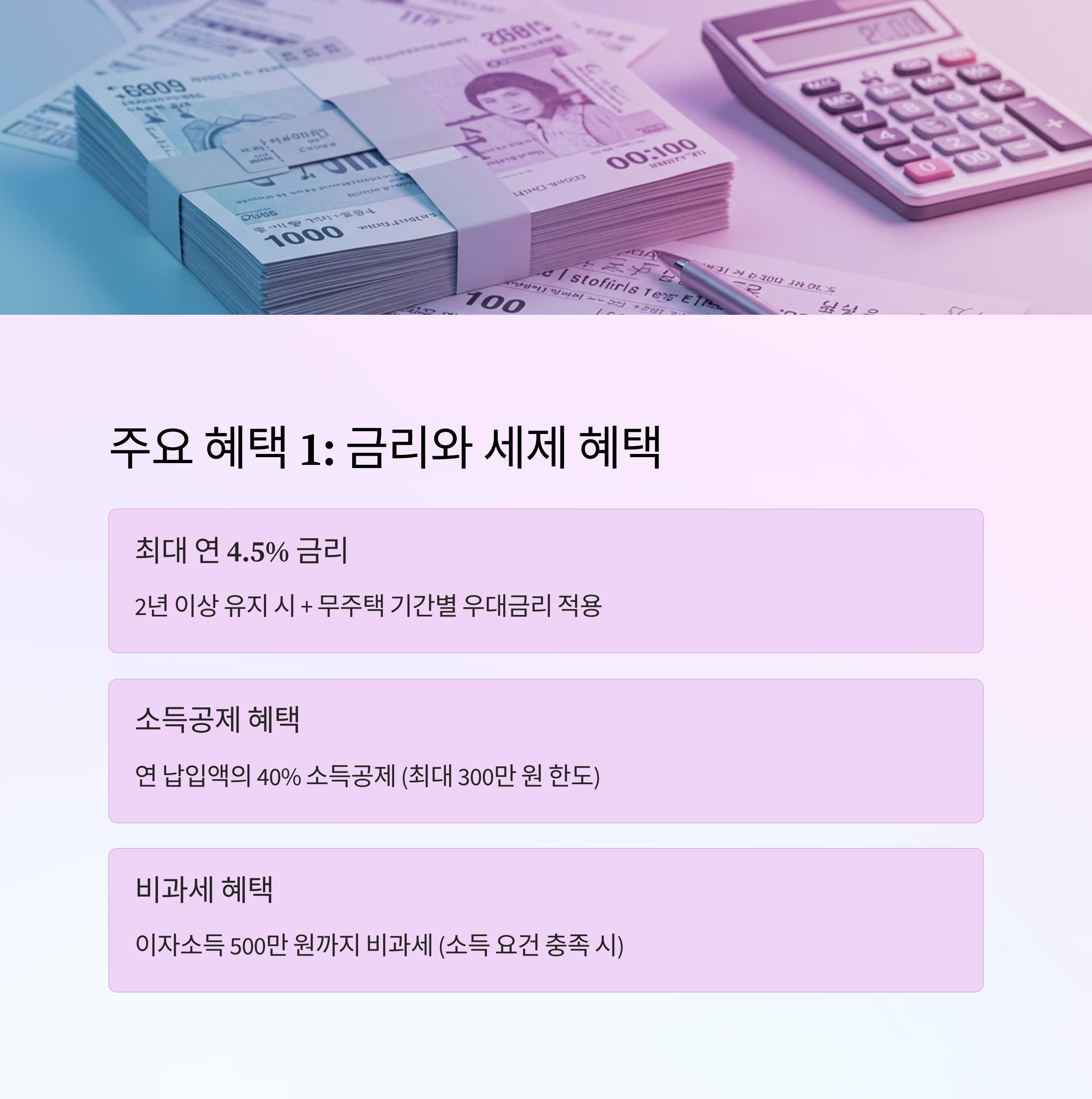 | 비과세 | 이자소득 500만 원까지 비과세 (소득 요건 충족 시) |