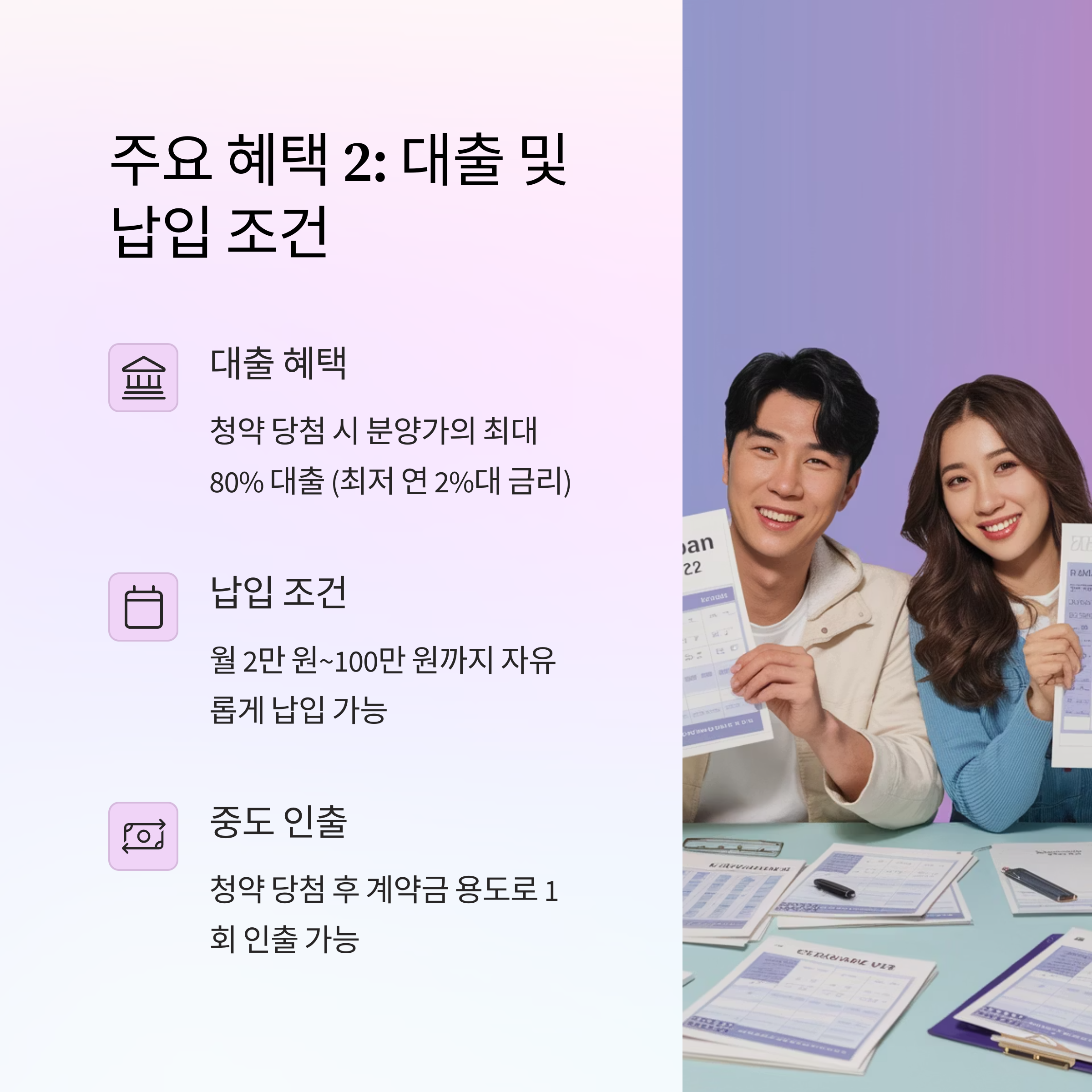 | 대출 | 청약 당첨 시 분양가의 최대 80% 대출 (최저 연 2%대 금리) |
