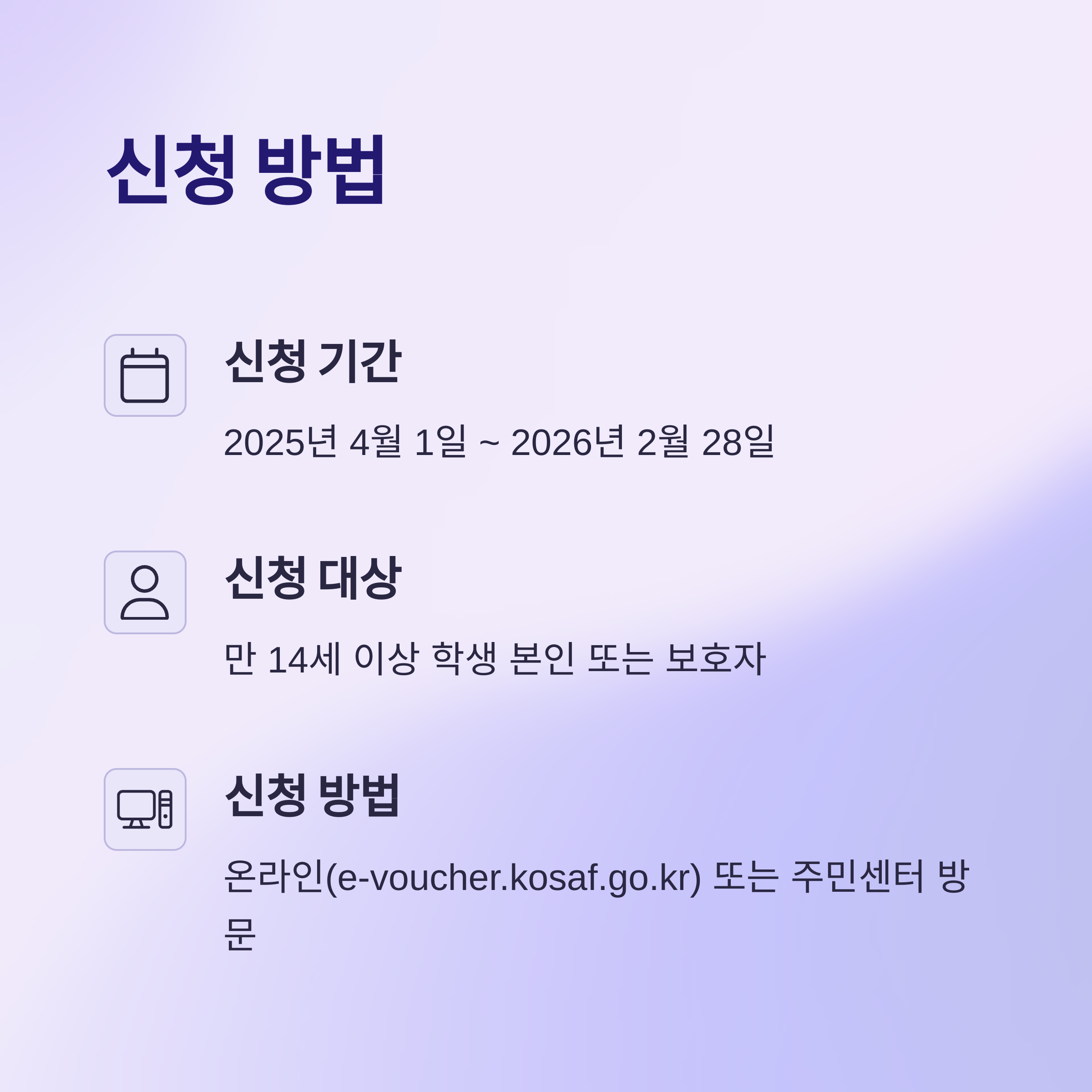 - 신청 대상: 만 14세 이상 학생 본인 또는 보호자(세대주, 성인 세대원 등)