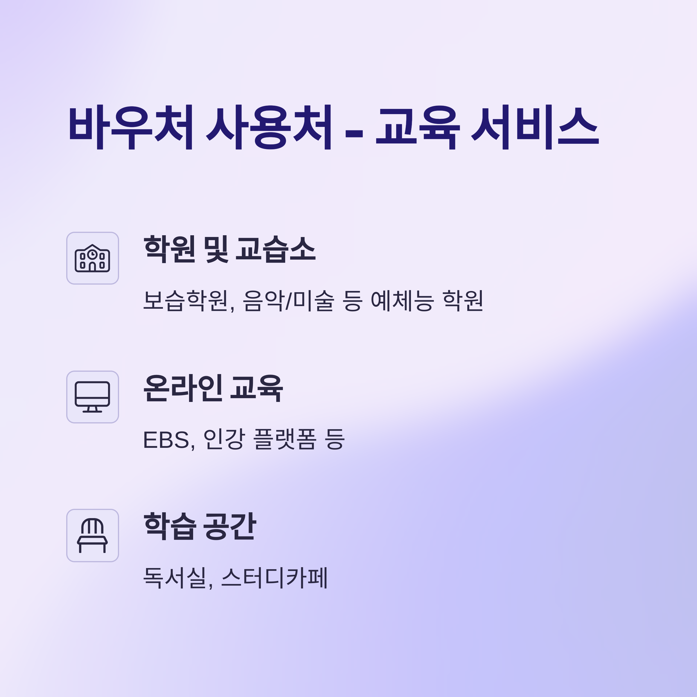 - 온라인 교육: EBS, 인강 플랫폼 등