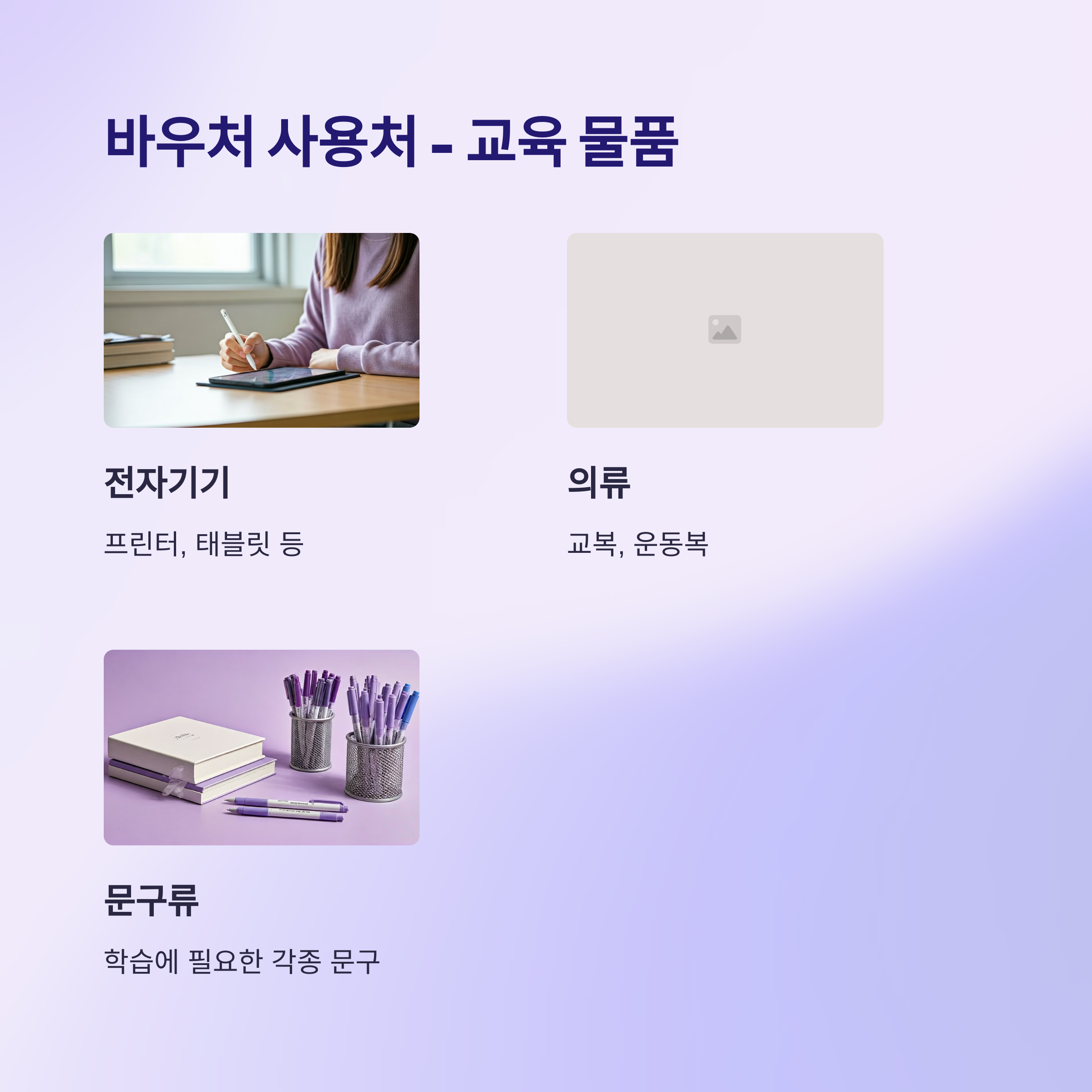 교육급여 바우처는 단순한 책값이 아닙니다. 다양한 교육 관련 지출에 사용할 수 있습니다: