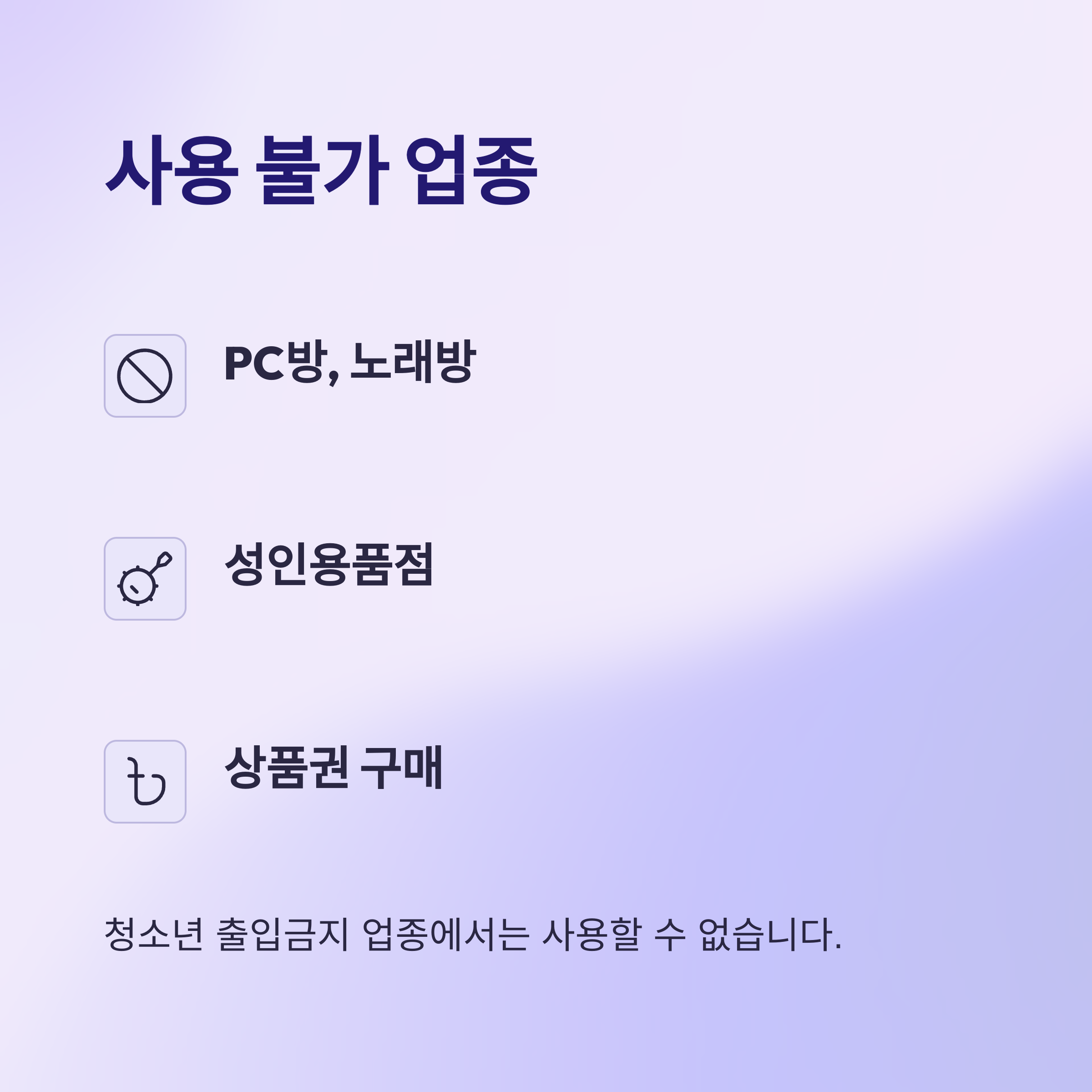 ❌ 사용 불가 업종: PC방, 노래방, 성인용품점, 상품권 구매 등 청소년 출입금지 업종