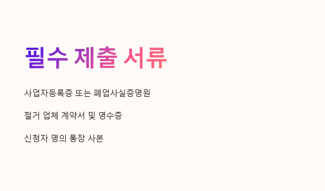 ✔ 사업자등록이 되어 있는 철거 업체를 이용해야 하며, 영수증 제출 필수