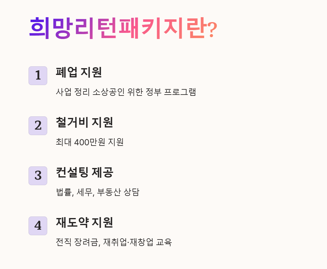 소상공인 희망리턴패키지는 사업을 정리해야 하는 소상공인들에게 철거비 지원, 폐업 컨설팅, 재취업·재창업 교육 등 실질적인 도움을 제공하는 정부 지원 프로그램입니다.