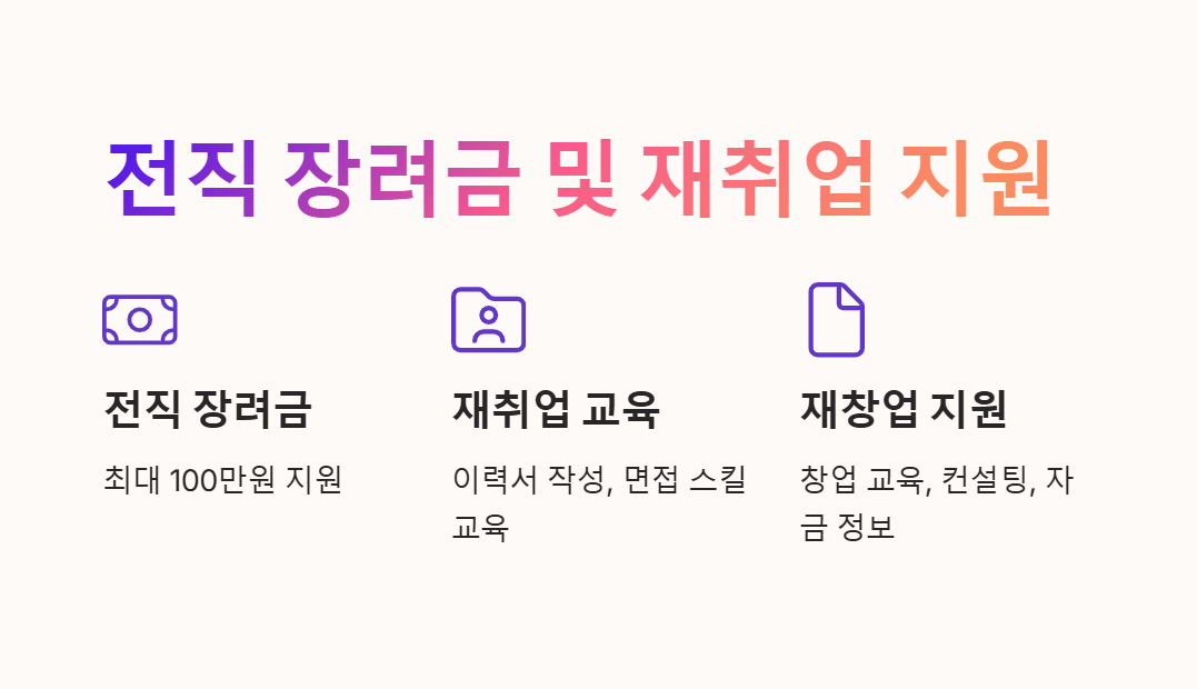 - 전직 장려금 지원 (구직 시 최대 100만 원 지급)