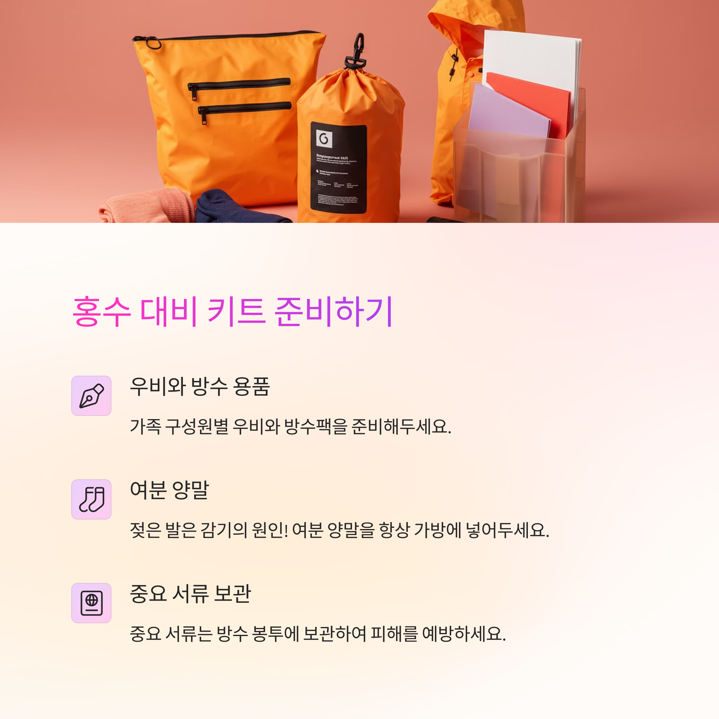 - ✅ 홍수 대비 키트: 우비, 방수팩, 여분 양말, 서류 보관