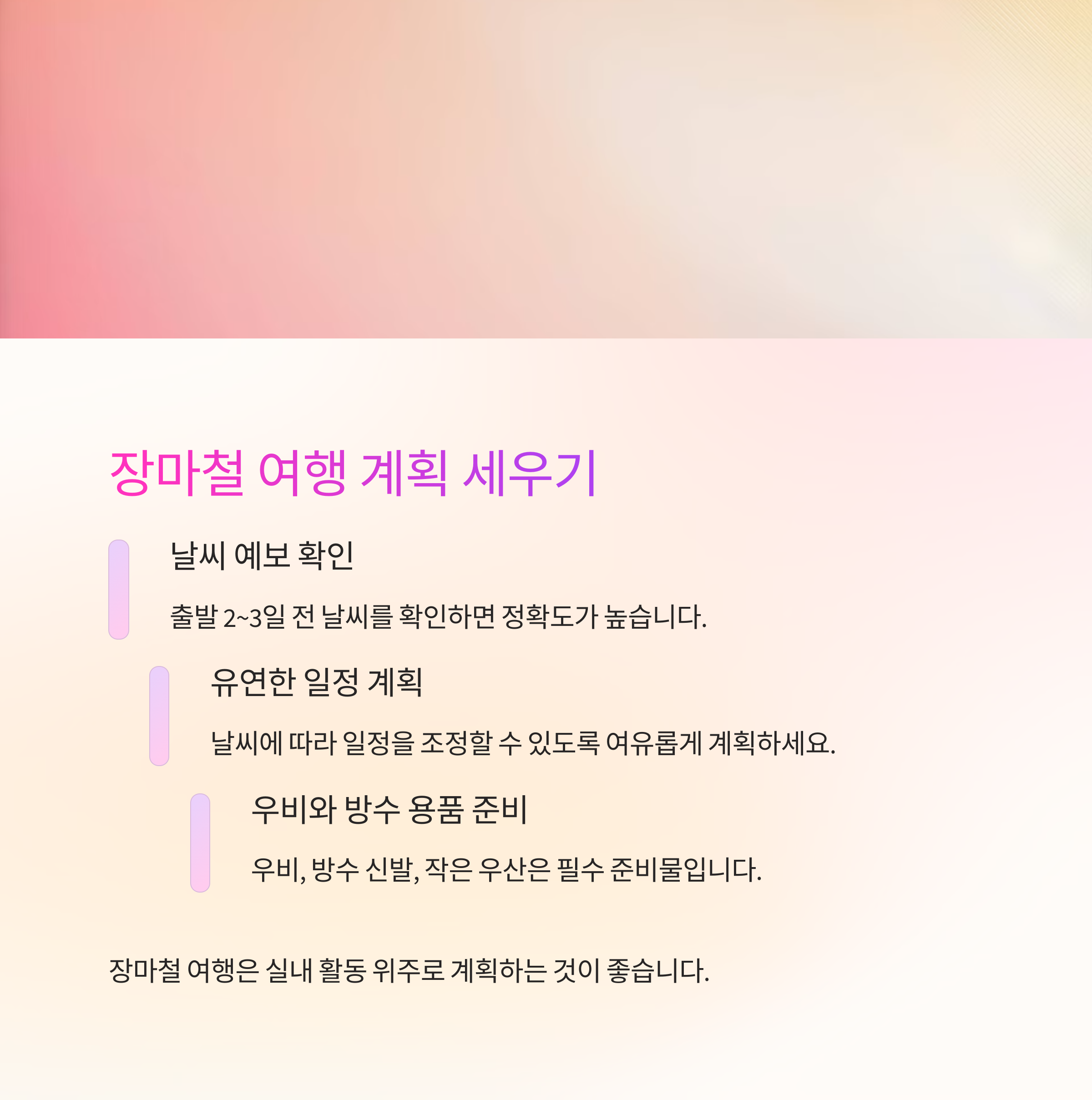 A. 비 소식 여부는 출발 2~3일 전 예보를 참고해 일정을 조정하는 것이 좋습니다.