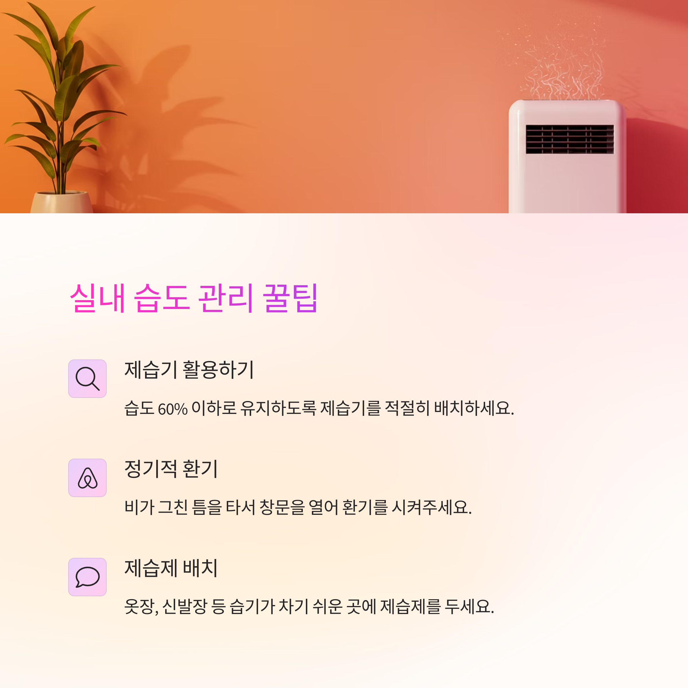 - ✅ 실내 습도 관리: 제습기 + 제습제 + 환기
