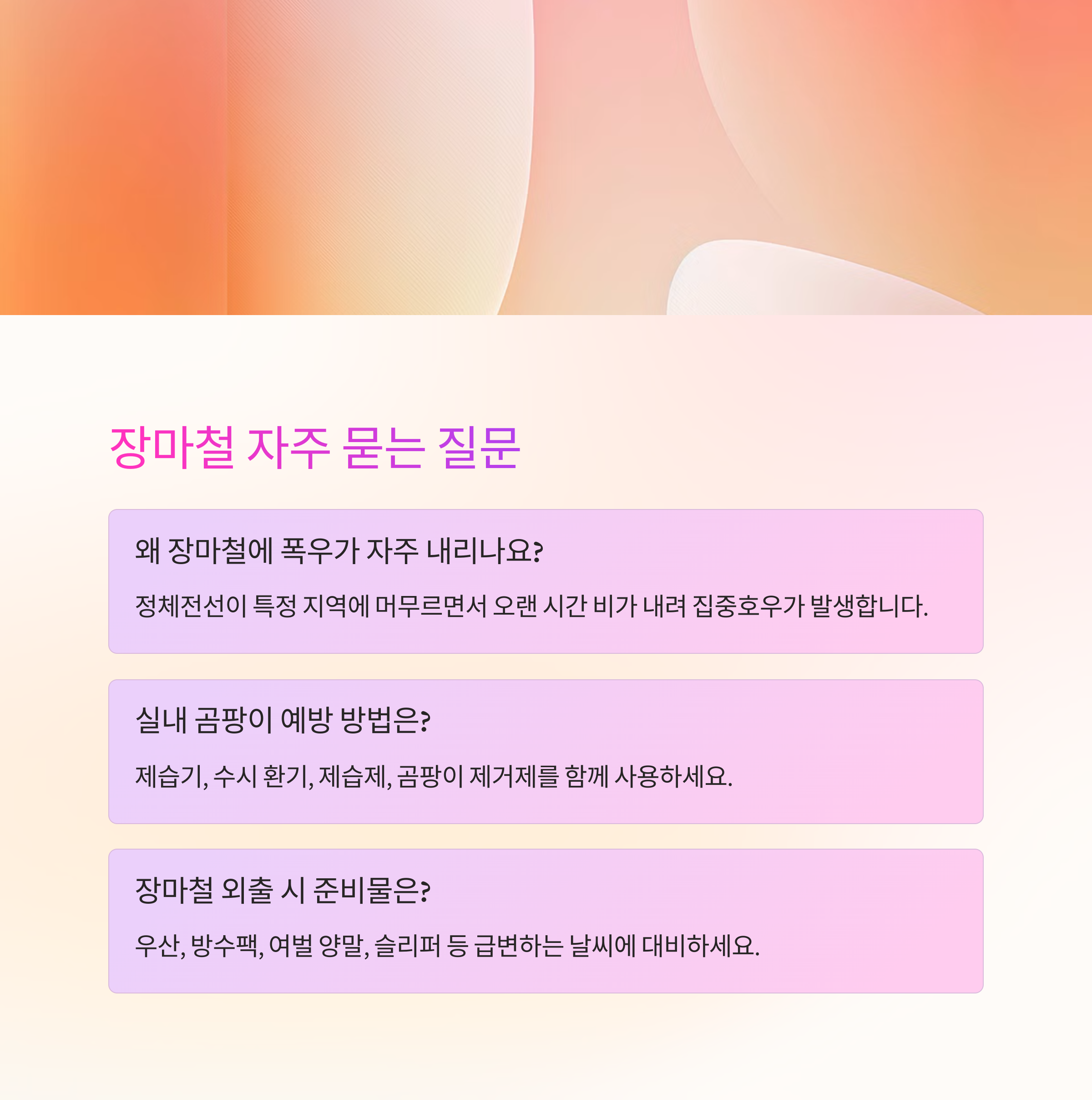 2025년 여름, 장마철은 언제 시작될까요? 갑작스러운 폭우와 꿉꿉한 습기로 인해 매년 반복되는 불쾌한 장마, 미리 대비하면 훨씬 수월하게 보낼 수 있습니다.