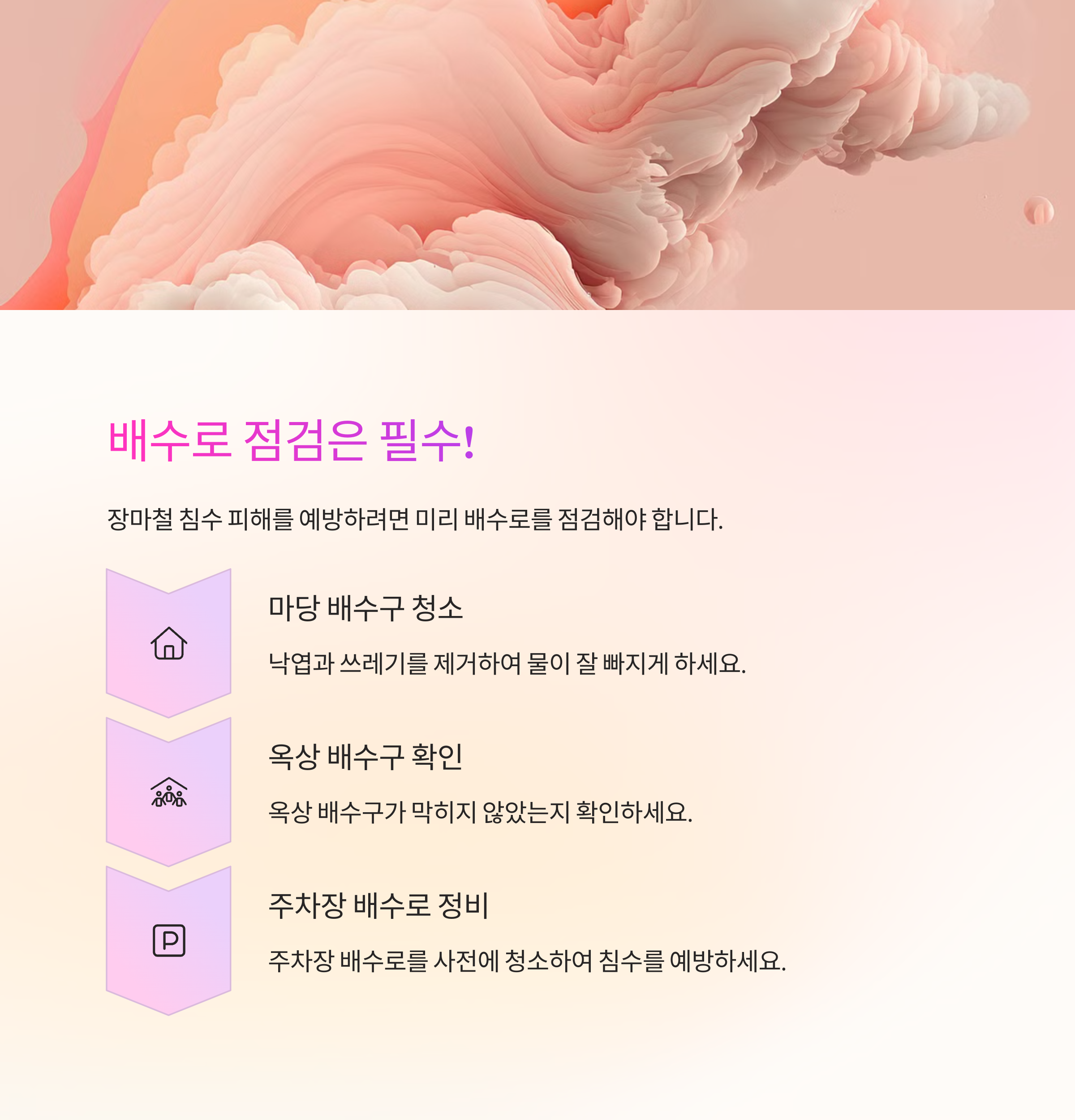- ✅ 배수로 점검: 마당, 옥상, 주차장 등 사전 정비