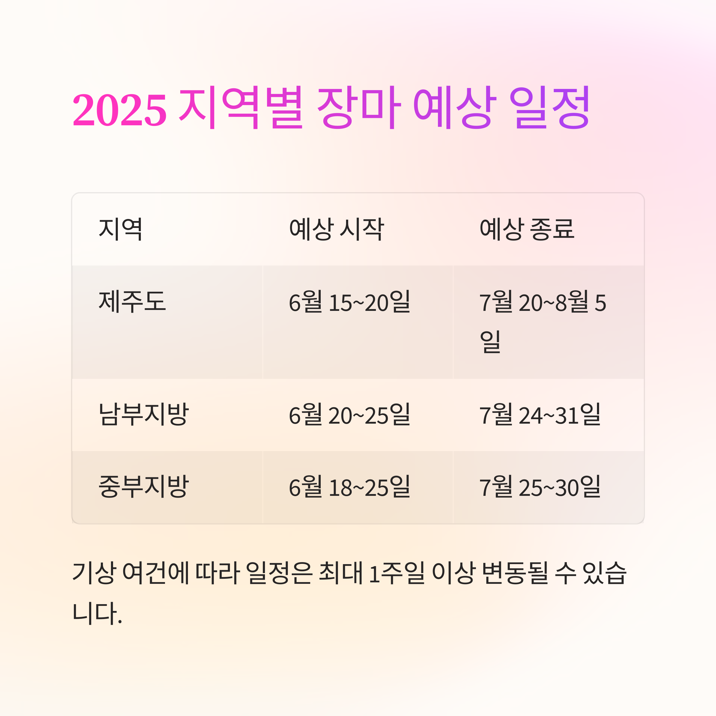 2025 장마기간 지역별 예상 일정
