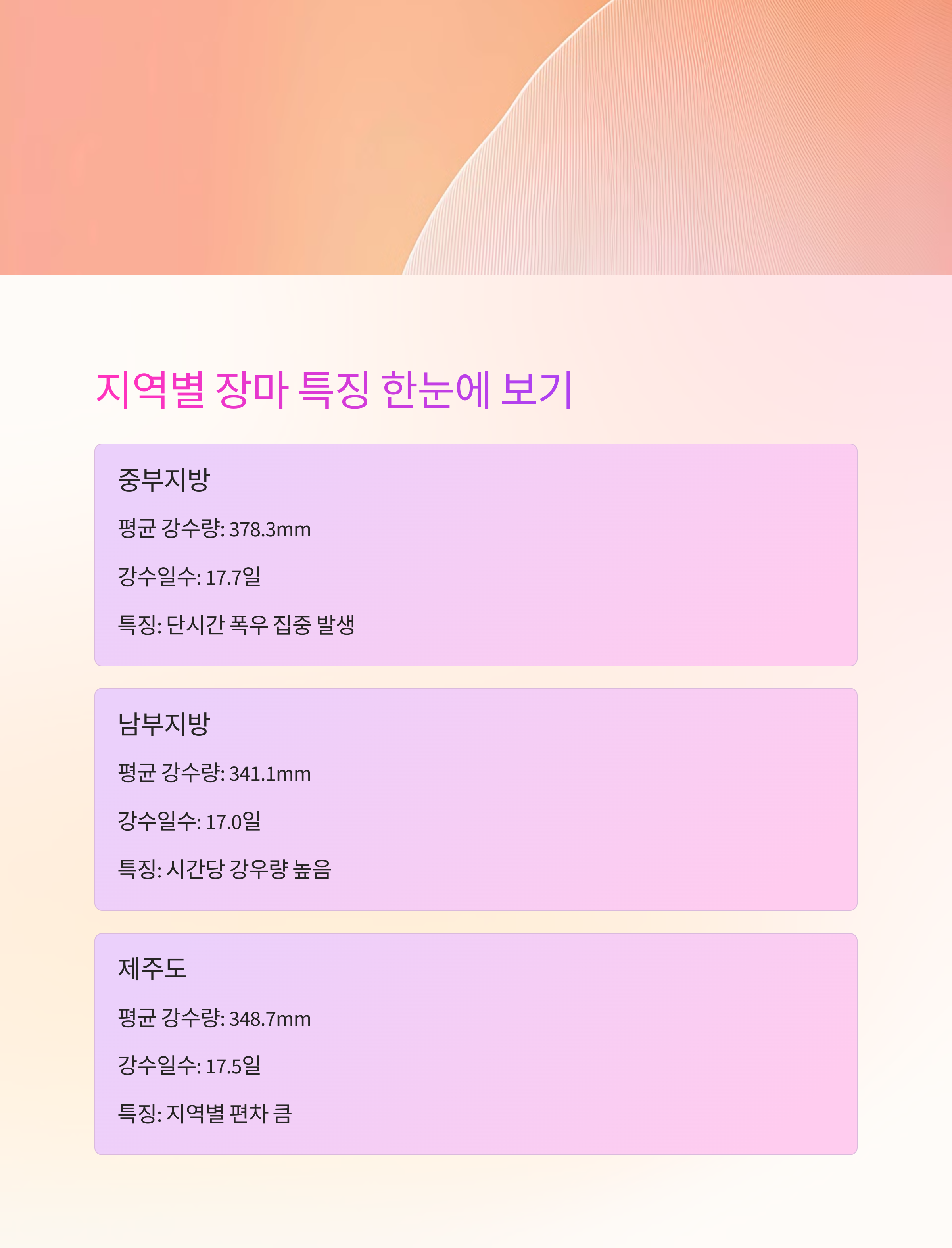 | 중부지방 | 378.3mm | 17.7일 | 단시간 폭우 집중 발생 多 |